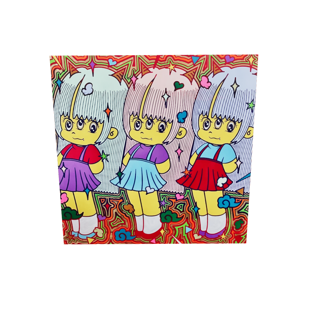 この作品は、ポップアート的な鮮烈な色彩と、伝統的な妖怪的要素を融合させた、現代における「鬼女(きじょ)」の再解釈です。 3体の少女のようなキャラクターは、同一人物の異なる側面を映し出しているのか、それとも複数の存在が共鳴し合いながら現れているのか——その答えは観る者に委ねられています。 彼女たちの3つの目は、人間の知覚を超えた視点を持ち、世界の裏側までも見通しています。 ピンクの髪に生えた角は、可愛らしさの奥に潜む異質な力を示唆し、頭上で爆発するようなエネルギーは、彼女たちの強大な精神力と感情の解放を象徴しています。 背景の迷宮のようなパターンは、彼女たちが存在する異次元的な空間、あるいは混沌とした現代社会そのものを映し出しているのかもしれません。 この「鬼女」は、単なる恐怖や怒りの象徴ではありません。 自由と反抗、そして未知なるものへの探求の象徴として、観る者に問いかけます。