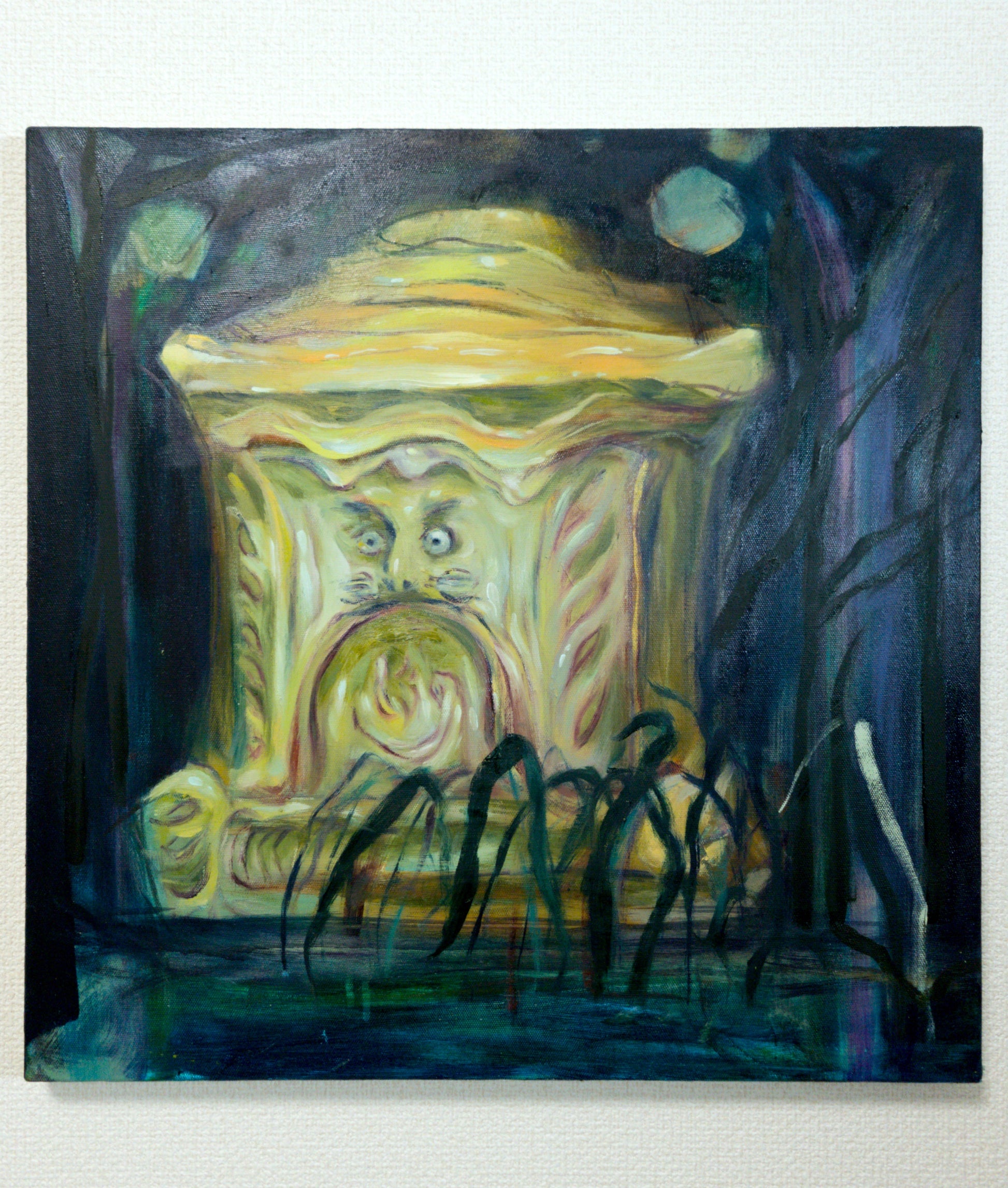 意識して見ているものは本当に自分の目で見ているのか。見ている対象と目が合ったとき、その意識の裏側の像を掴みたいという思いで描き出している。身体を通して流れ込んできたイメージは意識の表層と裏側を往復するように画面に現れる。