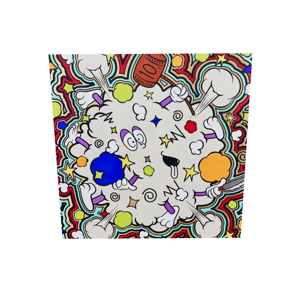 この作品「一揆」は、抑え込まれた感情や衝動が一気に爆発する瞬間を、ポップアート的な視点で描いたものです。 カラフルな煙や星、コミカルな目や手足が入り乱れる様子は、さまざまな思いがぶつかり合い、解放される混沌としたエネルギーを象徴しています。 中央に描かれたハンマーや拳、舌を出した表情は、ユーモアを交えつつ、反抗心や抵抗の精神を表現しています。 背景に広がる波打つラインは、衝動が拡散していく様子や、社会全体へ波及する影響を示唆しています。 「一揆」とは、単なる暴発ではなく、個と個がぶつかり合う中で生まれる新たなエネルギーの象徴です。 この作品では、混沌の中に潜む創造性と可能性、そして人間が本能的に求める解放の瞬間を描いています。
