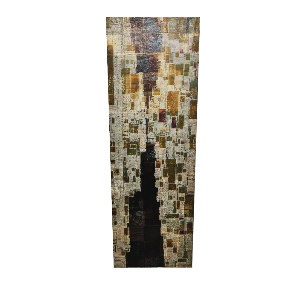 这是东京系列的作品。它描绘了城市不断地移动,建造,摧毁,修复,添加和重建,未完成的场景,整个城市都在建造,拆除,重建和复杂的演变中,表达了它在日常生活中所经历的场景,以及在车辆上旅行时看到的场景。使用Yuzen染色技术染色的两块丝。染色的织物支撑是由银箔制成的,银箔已被吸烟并改变了颜色,以及带有质地的木工面板。